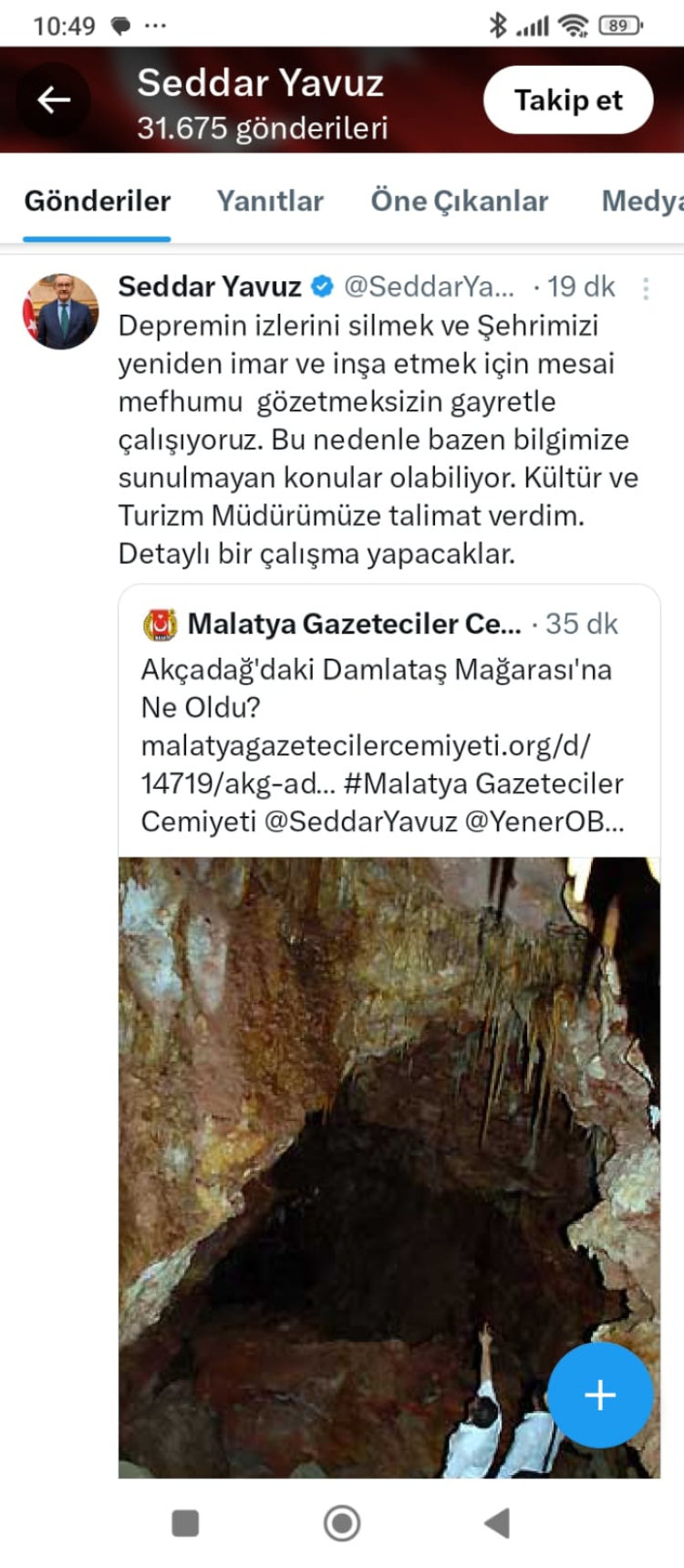 Malatya Valisi Seddar Yavuz, Akçadağ'ın Bayramuşağı yakınlarında 17 yıl önce Karayolu çalışması sırasında ortaya çıkan Damlataş Mağarasının ne olduğu konusunda haberlerin paylaşılması üzerine sosyal medya hesabından Damlataş Mağarası için kapsamlı bir araştırma talimatı verdiğini açıkladı.