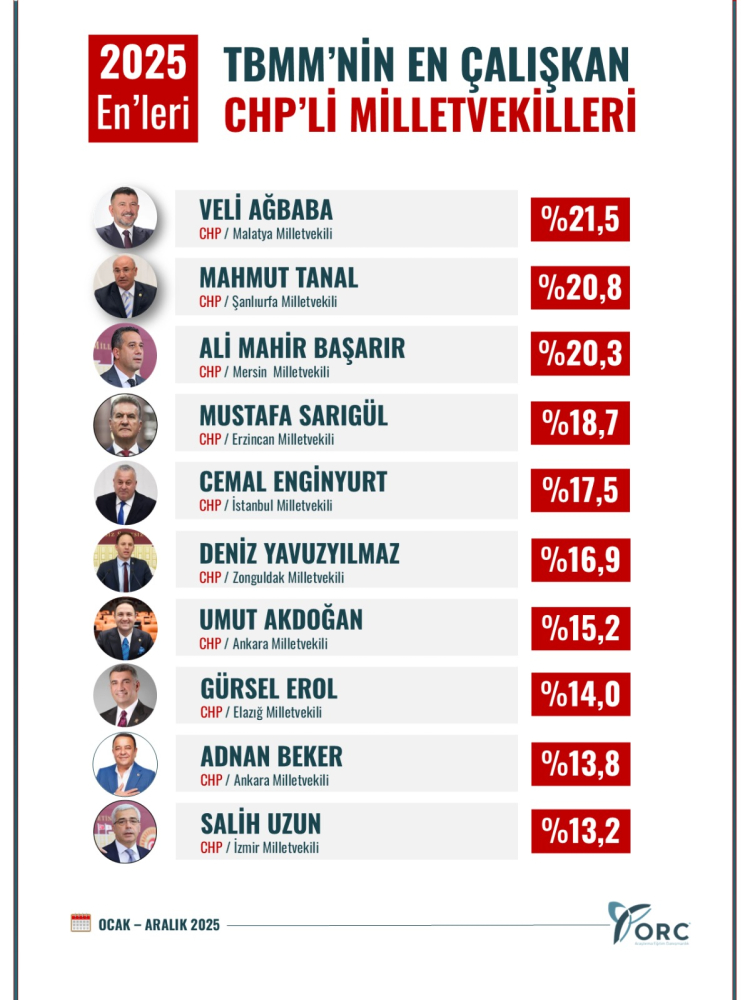 Sıralamada Veli Ağbaba’yı yüzde 20,8 ile Şanlıurfa Milletvekili Mahmut Tanal ve yüzde 20,3 ile Mersin Milletvekili Ali Mahir Başarır izledi. Mustafa Sarıgül, Cemal Enginyurt, Deniz Yavuzyılmaz, Umut Akdoğan, Gürsel Erol, Adnan Beker ve Salih Uzun da listenin ilk 10 sırasında yer aldı. Araştırma sonuçları, CHP’nin özellikle sosyal politika, ekonomik sorunlar, enerji ve deprem bölgelerine ilişkin konularda aktif bir milletvekili kadrosu oluşturduğunu gösteriyor.