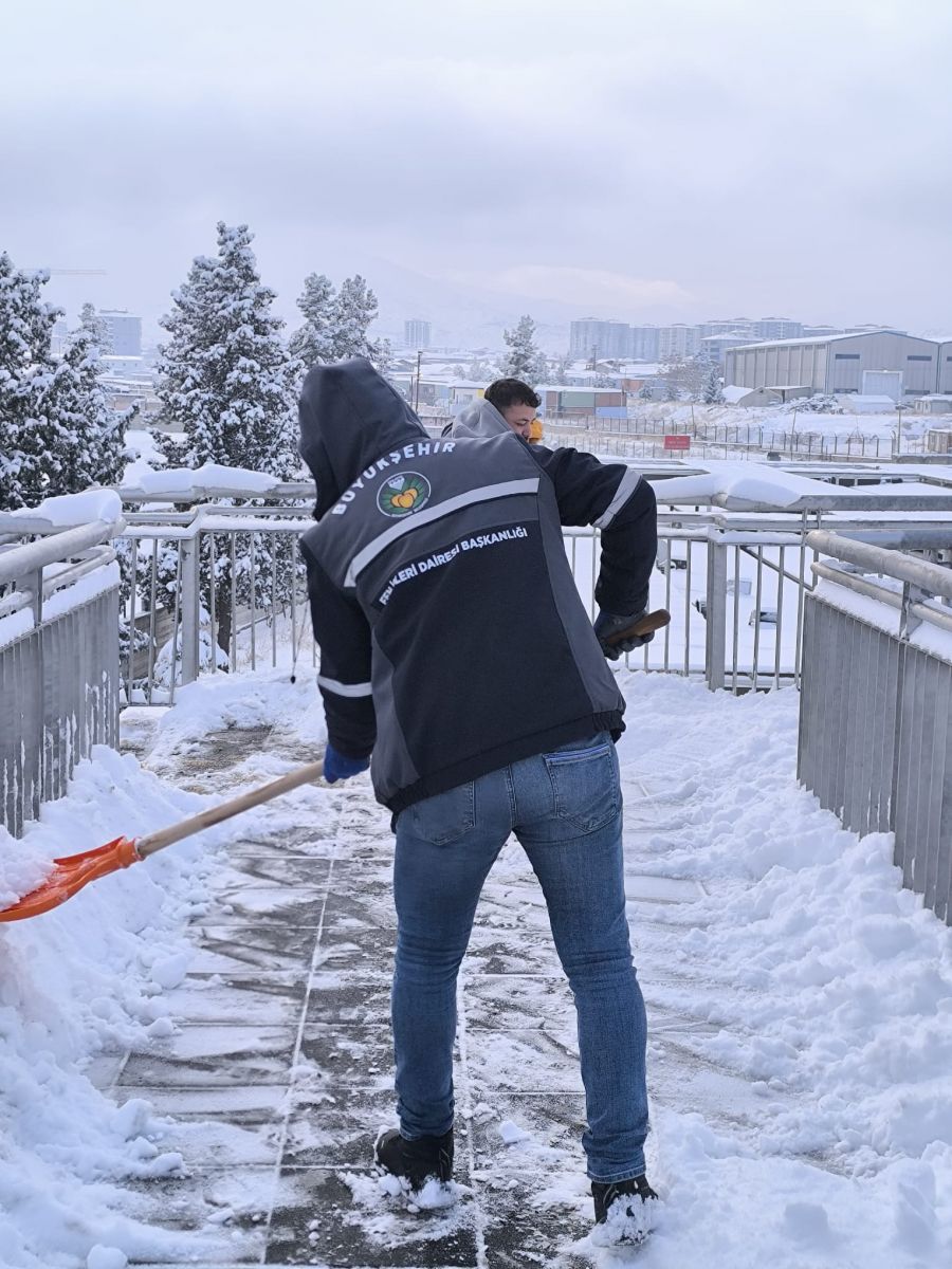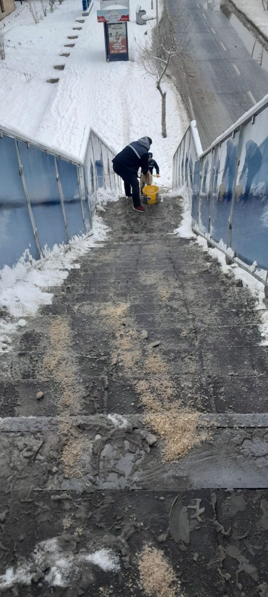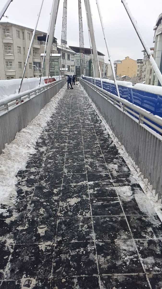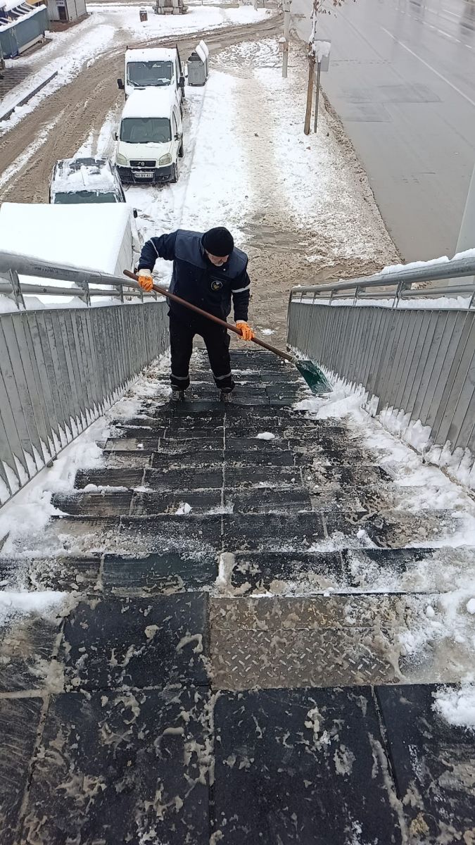 Üst geçitlerdeki basamaklar, engelli asansörlerinin önleri ve yürüyüş yolları, ekipler tarafından büyük bir titizlikle kardan arındırıldı. Olası buzlanmalara karşı solüsyon ve tuzlama çalışmalarının da eşlik ettiği temizlik süreci, vatandaşların kayıp düşme riskini ortadan kaldırmayı hedefliyor.