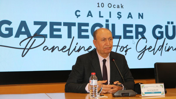 Belovacıklı’dan sonra sözü alan Prof. Dr. Nurettin Güz, 10 Ocak Çalışan Gazeteciler Günü'nün tarihçesi hakkında bilgi verdi. Gazetecilik etiğine ilişkin önemli açıklamalarda bulunan Prof. Dr. Güz, “Etik konusu yıllardır tartışılıyor. Haber yazarken reklamla haberin ayrımı net olmalıdır. Para alınmışsa bu reklamdır; alınmamışsa haberdir. Bu ayrımı yapacak olan mekanizma çoğu zaman iletişimcinin vicdanıdır. Yapay zekâ ile ilgili olarak, iletişim mekanizması içinde haber dâhil içerik üretirken yapay zekâyı artık kullanmamak mümkün değildir; ancak nasıl kullanıldığını bilmek zorundayız.Medya, bilim teknolojiyi yakından takip eden ilk alan olmuştur. Çünkü temelinde hız vardır. Bu alandaki gelişmeleri takip etmeye ihtiyacımız var. Sosyal medyanın yaygınlaşmasıyla beraber medya içerikleriyle daha çok ilgilenir olduk. Dünyada 5.6 milyar insan aktif olarak sosyal medya kullanıyor. Sosyal medya herkese açık bir alan. Dolayısıyla küresel boyutundan dolayı hassasiyet son derece önemli. Teknoloji geliştikçe bazı mesleklerin ortadan ileride kalkacağı konuşuluyor ama iletişim mesleğinin kalkacağına dair bir öngörü yok. Ama geleneksel medya daralacak. İletişim mesleği ile ilgili yeni fırsatlar ortaya çıkacak. Örneğin sosyal medya danışmanlığı.” dedi.